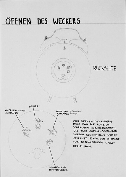 Eine zeichnerische Selbsterfahrung in der Auseinandersetzung mit der Funktionsweise eines Wecker-Uhrwerks.