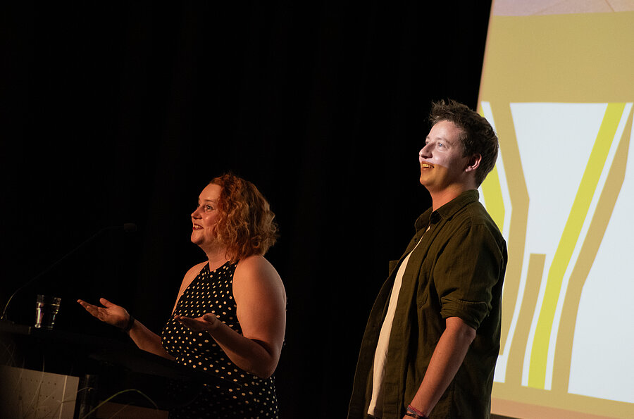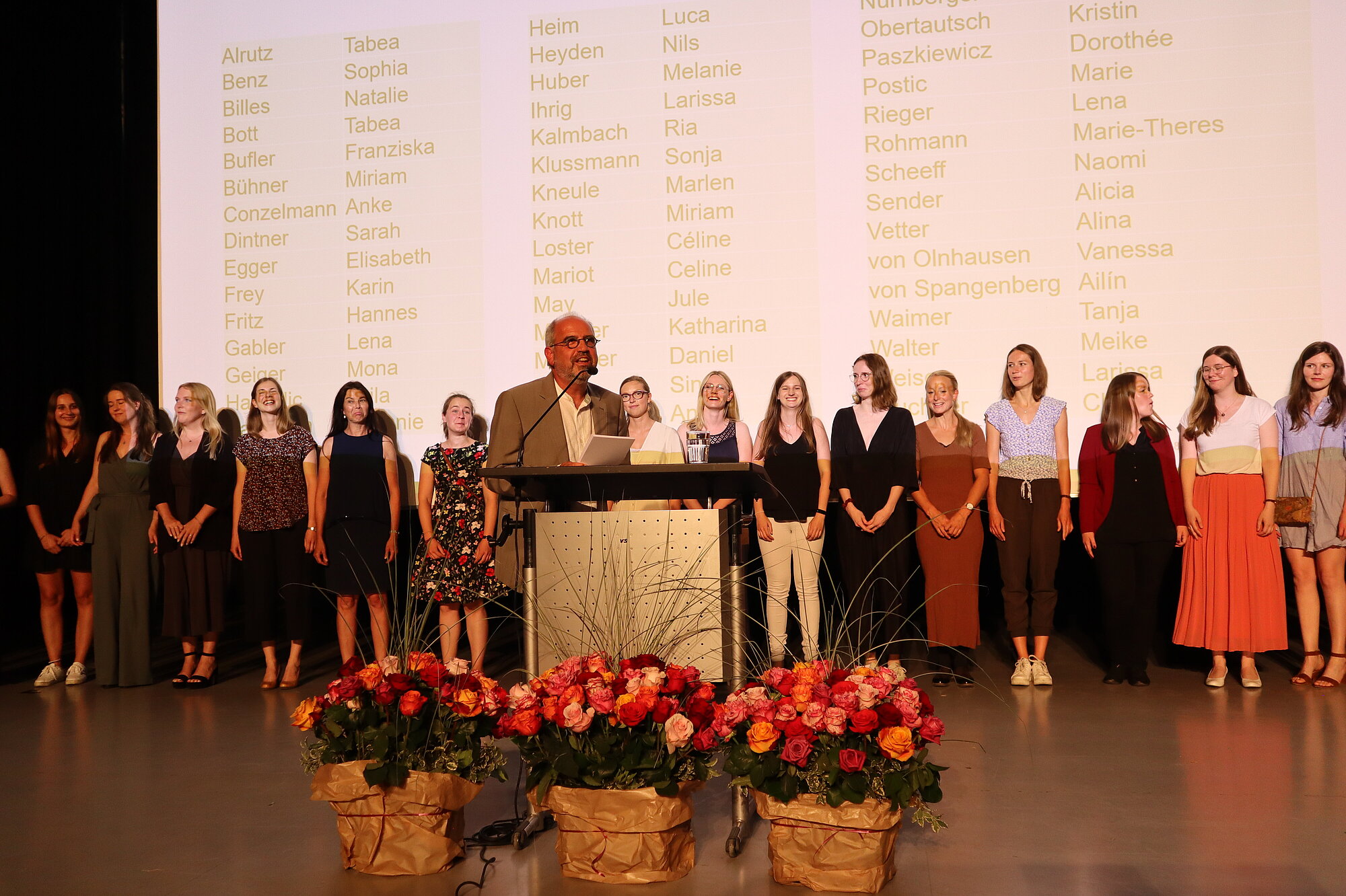 Die gemeinsame Feierstunde findet in Gebäude 1 mit musikalischem Rahmenprogramm, Reden, einer Preisverleihung und Gruppenfoto statt, zu der alle Absolvent*innen eingeladen sind.