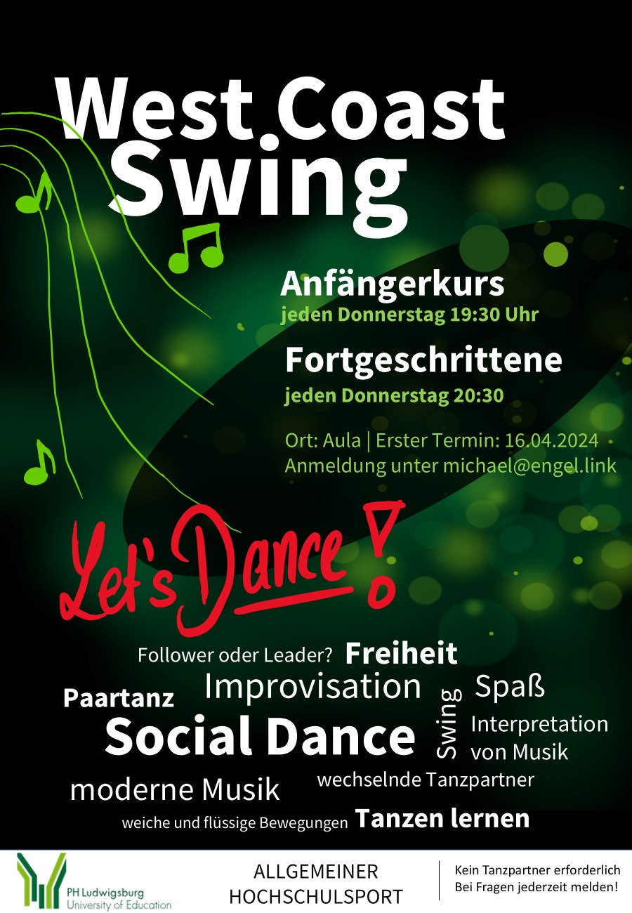 Tanzkurs West Coast Swing Anf. Fortg. | Donnerstag: 19:30-20.30 Uhr 20:30-21:30 Uhr | Aula | Michael Engel | michael(at)engel.link |