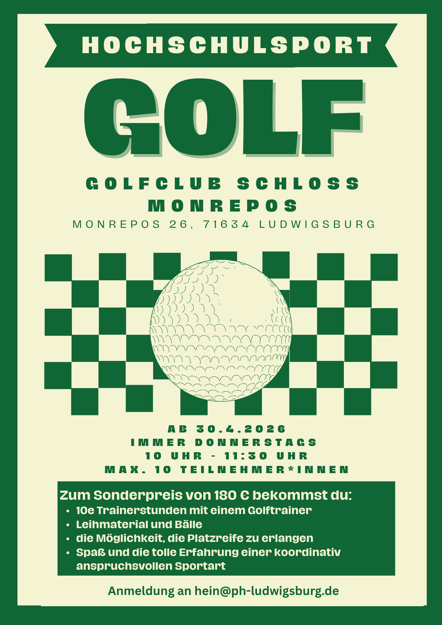 | NEU ab 30.4.! Golf Weitere Infos | Donnerstag: | Colfclub Schloss Monrepos | Anmeldung über: hein(at)ph-ludwigsburg.de | |