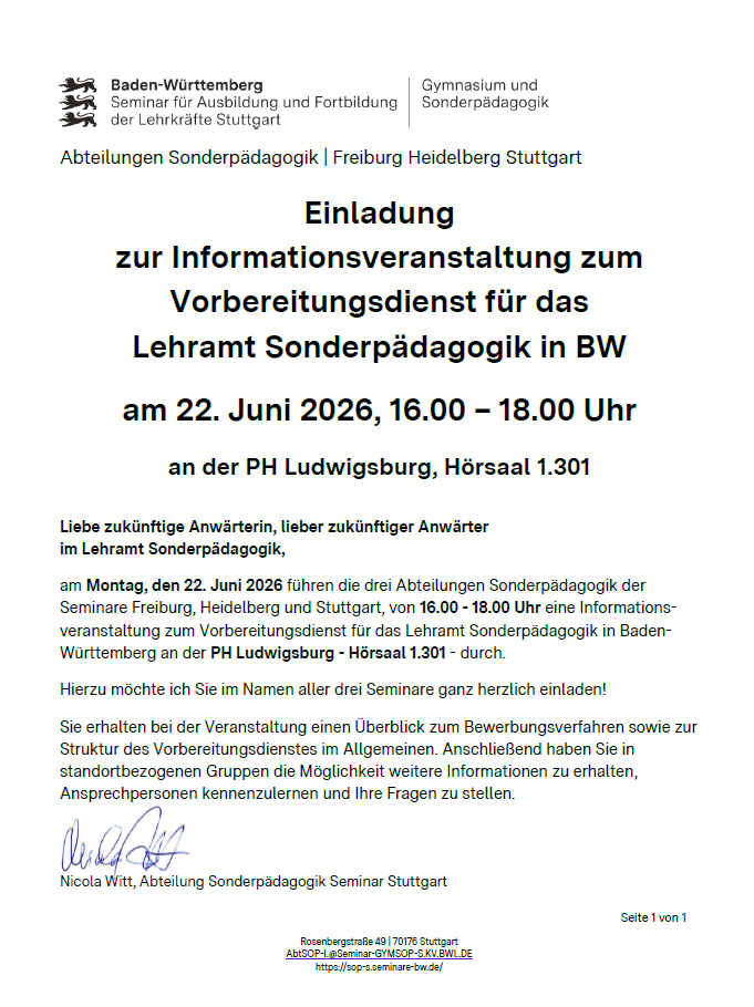 Die drei Seminare Freiburg, Heidelberg und Stuttgart laden recht herzlich zur Informationsveranstaltung zum Vorbereitungsdienst für das Lehramt Sonderpädagogik in BW ein. Die Veranstaltung findet am Montag, den 22.06.2026 in der Zeit von 16 - 18 Uhr statt. Weitere Informationen finden Sie hier.