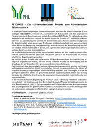 Im Rahmen des Projektes RESONARE findet im WiSe25/26 ein Projektseminar in Zusammenarbeit mit der Albert-Schweitzer-Schule Stuttgart, dem Verein Trimum e.V., dem Förderschwerpunkt ESENT und der Abteilung Kulturarbeit statt. Weitere Informationen darüber finden Sie in dem PDF-Dokument, welches über diesen Link zu öffnen ist.