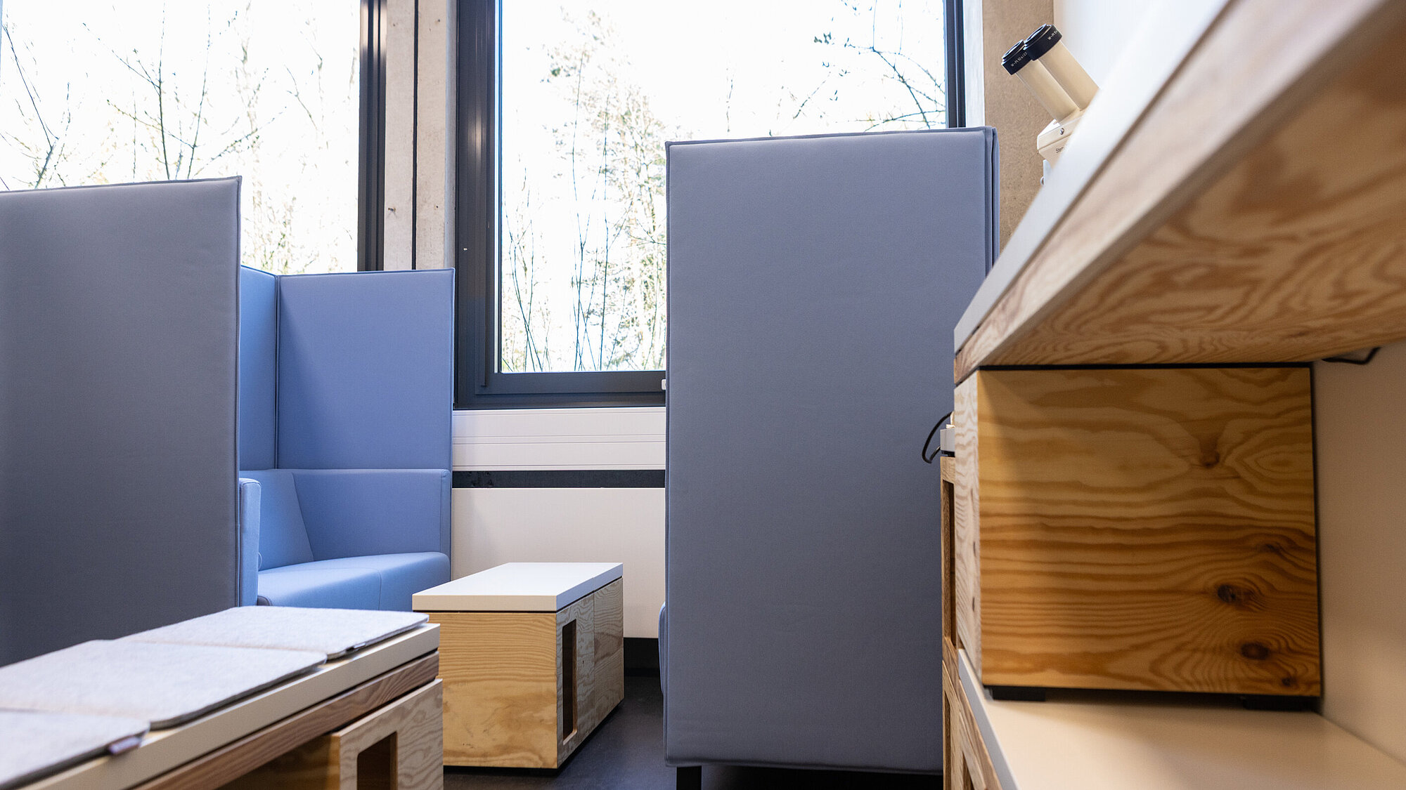 Der kleine Raum wurde als flexibler Raum mit Zonierungen für agiles Arbeiten eingerichtet: Eine Besprechungszone mit klassischem Besprechungstisch, eine Kooperationszone mit schallgedämmter Sitzgruppe und eine Einzelarbeitszone mit einem eingerichteten Arbeitsplatz. Zudem werden "multi-use"-Möbel genutzt, um flexible Raumkonzepte auch auf kleinem Raum zu gestalten. Ergänzt wird dies durch ein mobiles Präsentations-/ Konferenzsystem.