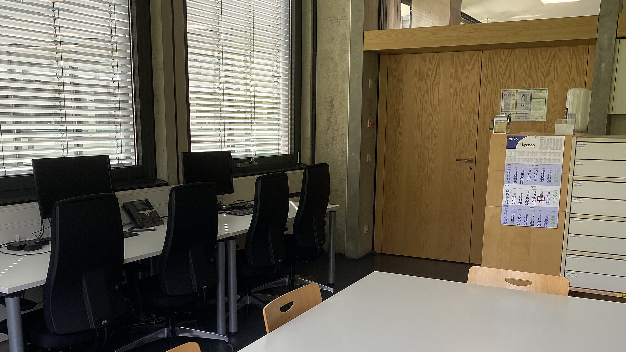 Der Raum wird multifunktional für Recherche, Besprechnungen, Kommunikation und zum Arbeiten (Ausweicharbeitsplätze) genutzt.