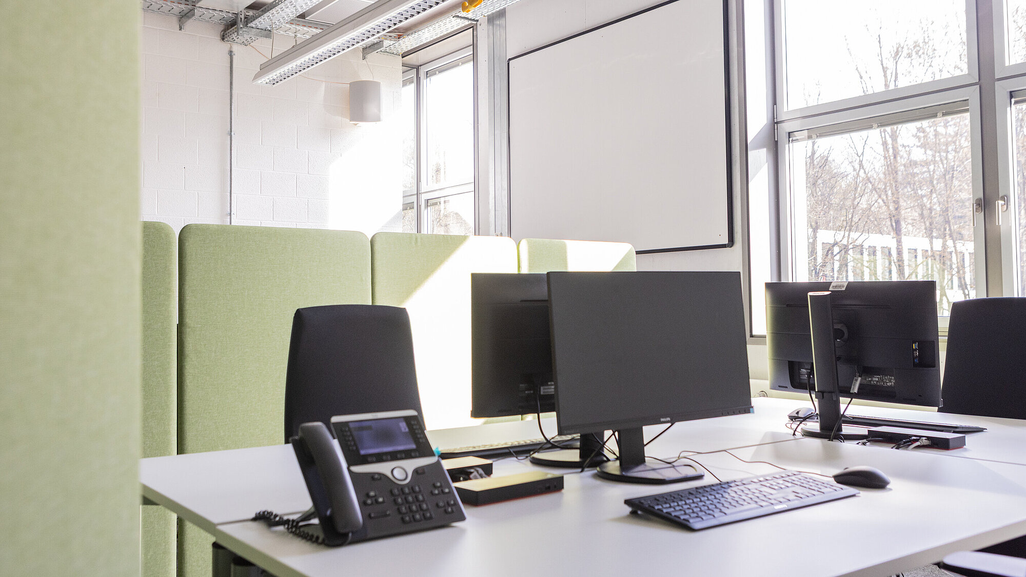 Der Raum wird vielfältig genutzt: E-Learning, PC-Pool in der Mittagszeit, Sprachlabor, Seminarraum mit PCs… Er dient auch als Gruppenarbeitszone mit Möglichkeiten zur gemeinsamen Techniknutzung (Drucker etc.). Mehrere mobile Trennwände und bequeme Sitzmöbel können flexibel angeordnet und für unterschiedliche Nutzungen optimiert werden.