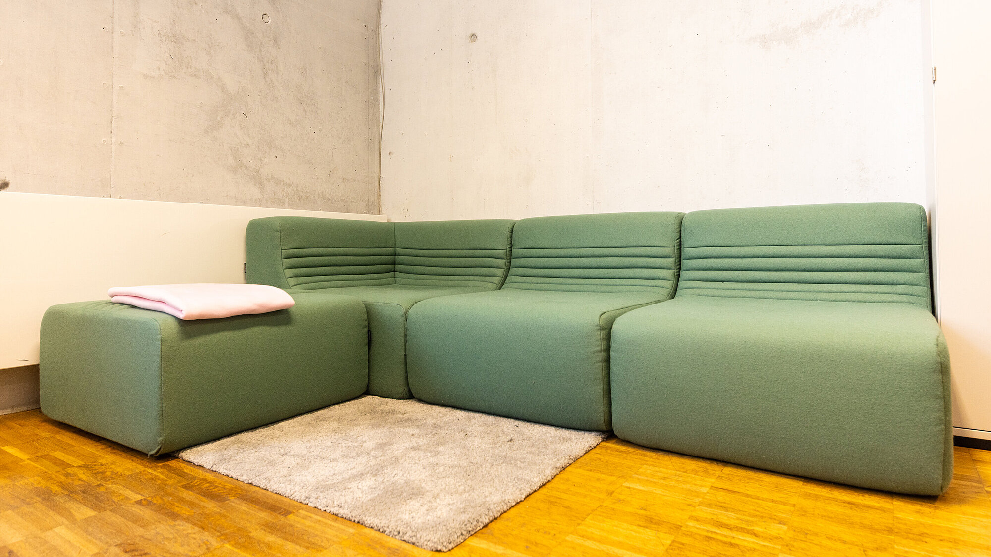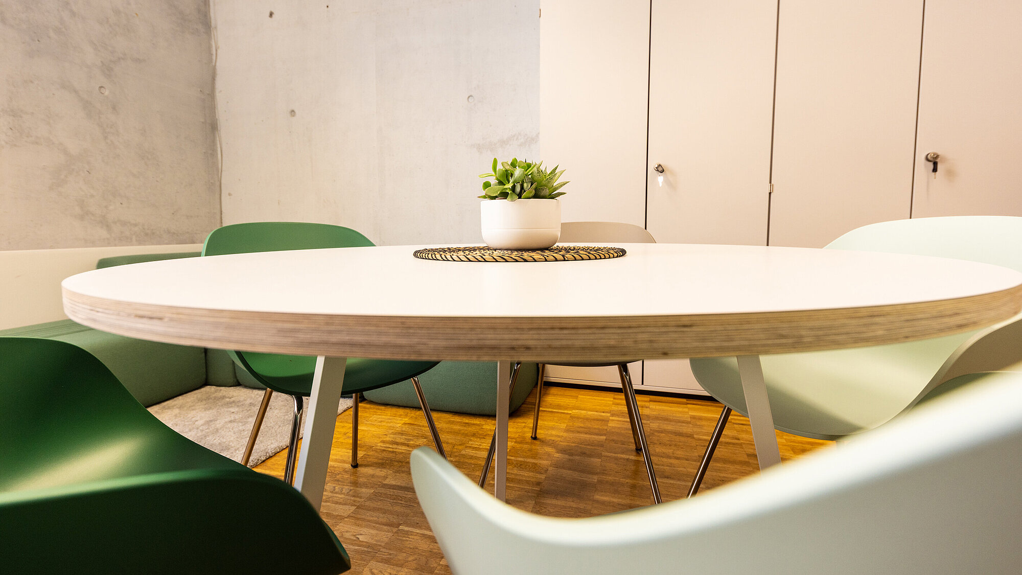 Der kleine Raum wurde als multifunktionaler, flexibler Raum mit Zonierungen eingerichtet: Eine Besprechungszone mit modernem Besprechungstisch, eine Kooperationszone mit einem bequemen Sofa und eine Einzelarbeitszone mit einem eingerichteten Arbeitsplatz. Das grüne Farbkonzept verbindet alle Bereiche.