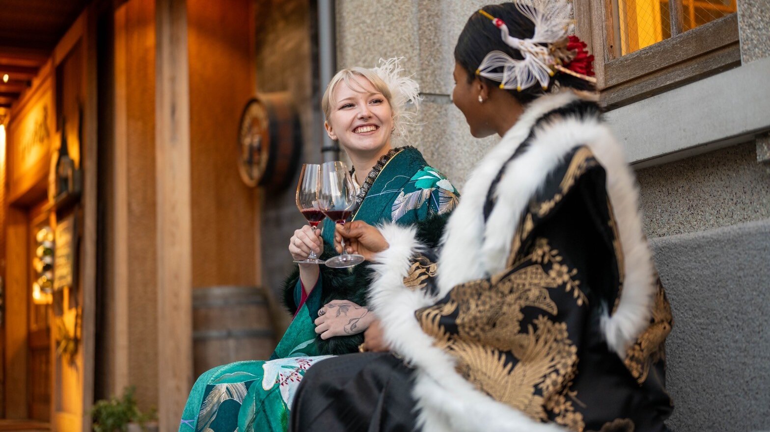 Der erste Platz ging an Jil Mogler (rechts), die sich mit einer Kommilitonin in traditionellen japanischen Kimonos beim Anstoßen mit einem Glas Wein fotografieren ließ. Das Bild vereint die charmante Ästhetik japanischer Tradition mit einem modernen Element und vermittelt ein Gefühl der Verbundenheit. Die Komposition und der gekonnte Einsatz von Licht verleihen der Szene eine ganz besondere Atmosphäre und machen das Foto zu einem würdigen Gewinner.
