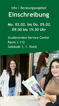 Am Montag, den 02.02. bis Donnerstag, den 05.02., findet jeweils von 09:30 bis 15:30 Uhr ein Beratungsangebot für alle Bewerber*innen mit Zulassungsangebot für das Sommersemester 2026 zum Thema Einschreibung an der Pädagogischen Hochschule Ludwigsburg statt.